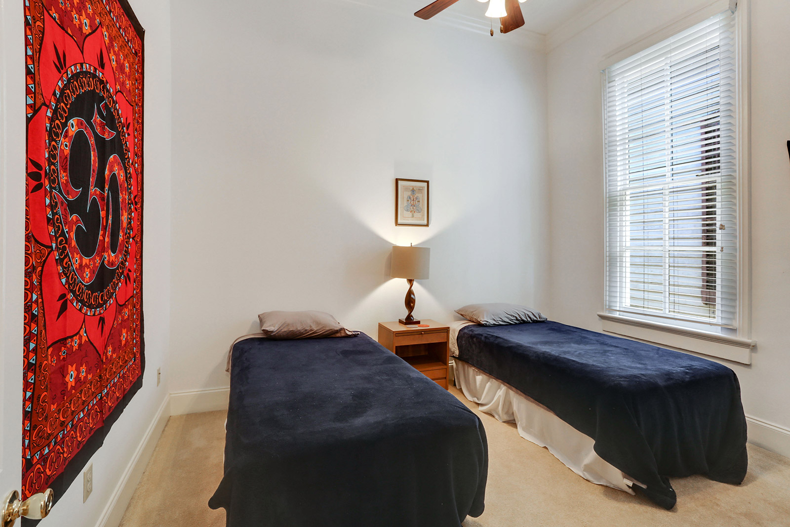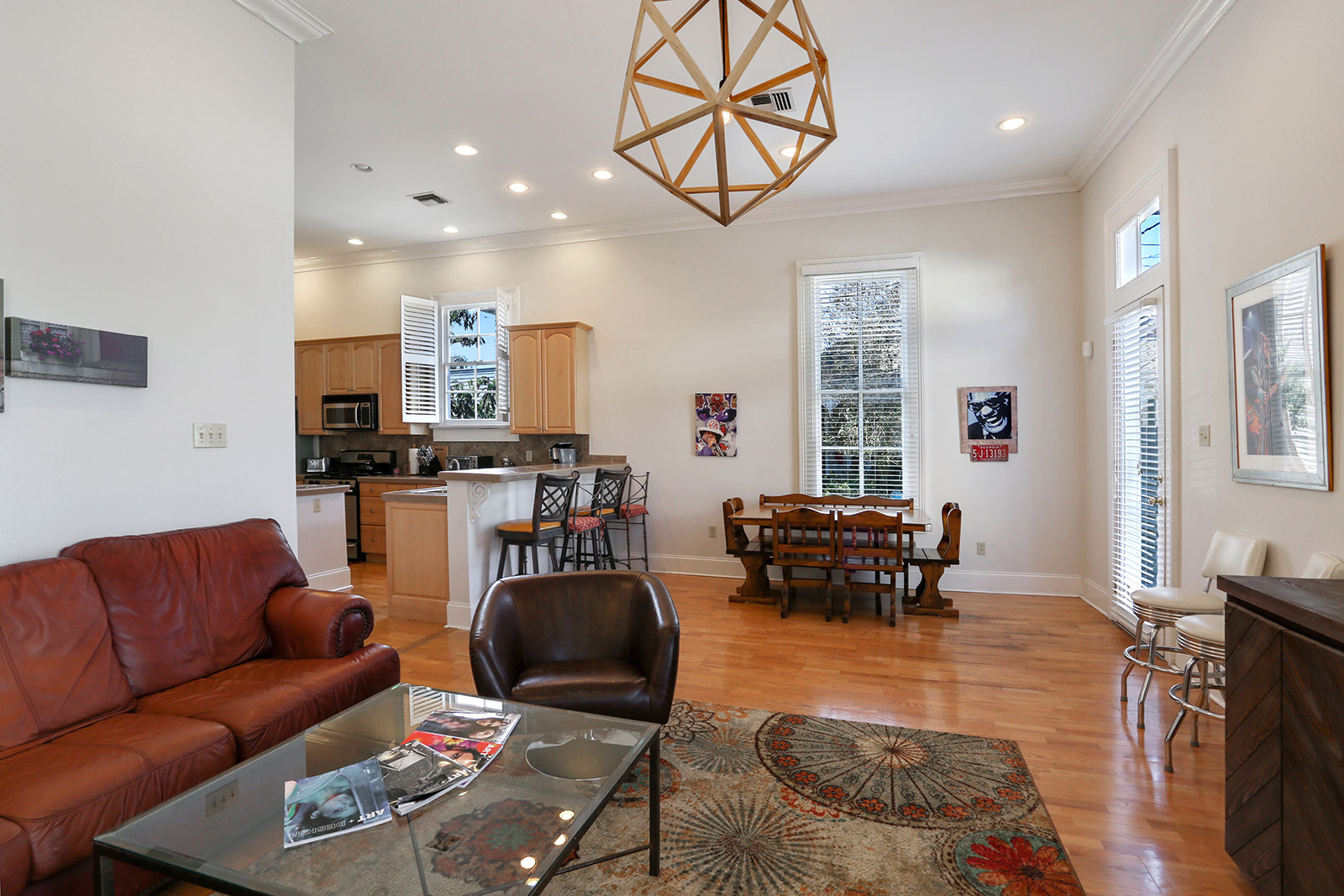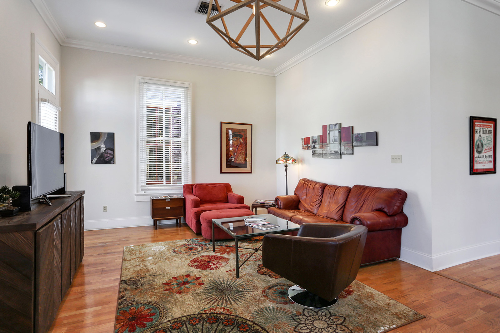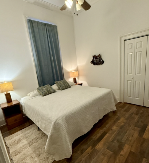 Enter into a double lounge/formal dining area on left and then walk into the Primary Bedroom on the right. With a comfy memory foam King bed and sitting area, this is a SPACIOUS room attached is a large bathroom with double vanity, shower AND large tub. There is also a large closet. Walk down the hall to find full laundry room on left including a sink and cabinetry. On the right is the 2nd bathroom between a KING bedroom and 3rd bedroom with 2 twins. The back 3rd of the house includes the open kitchen with island and 4 seat counter open to a large living area with informal dining area, leather sofa and 2 other comfy seats around a large smart TV. Out back is a bricked patio with BBQ and furniture, OR you can move that to the side and park your car in the back through the new driveway/gate. GREAT LOCATION and layout for 4-8. Live like locals in the classic New Orleans shotgun house!!