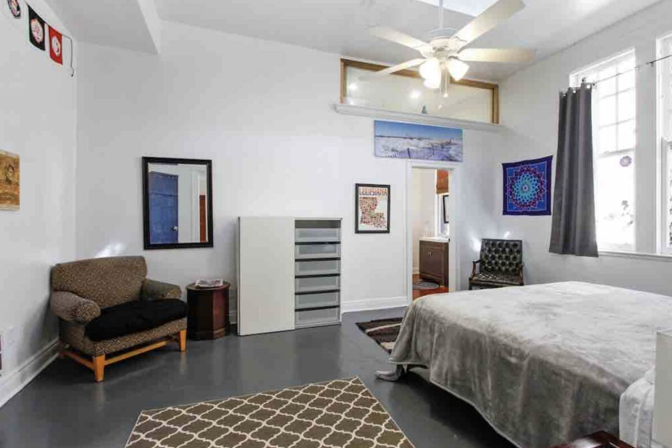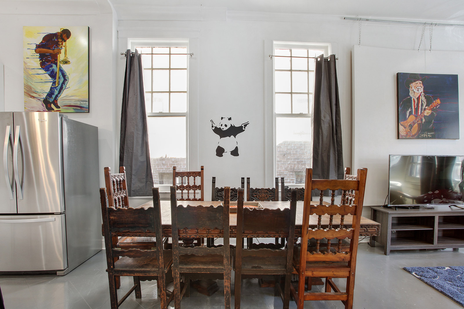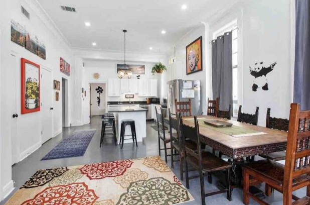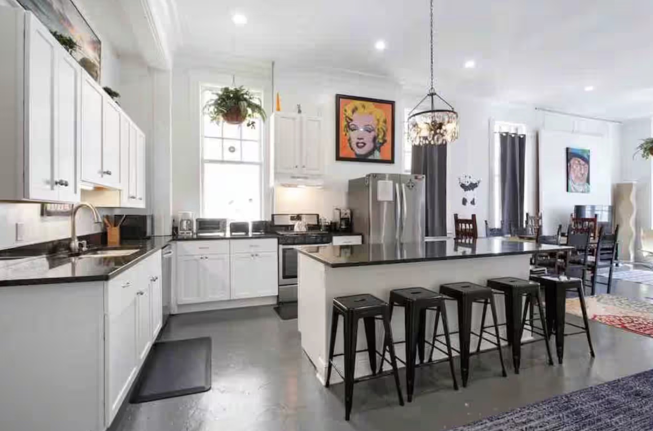 Location, location, location!! This huge & awesome property, is located on the second floor, one flight of stairs above a storefront art gallery in the heart of the Central Business District. It boasts 6 SUPER SPACIOUS BEDROOMS, most have a large couch, and can easily sleep from 14-16 guests. There are 5 FULL BATHS, 3 are within bedrooms and the other 2 are shared a few steps down the hall. The half bath is in the kitchen/lounge area for group convenience. This 4000+ sq ft unit is perfect for large families, or groups of up to 16. We have hosted many business groups in town for conventions. It's a nice walk to the Convention Center and the Superdome & Smoothie King Center. FULLY RENOVATED and stocked gourmet kitchen with dining table and granite island - plenty of seating, huge lounge with leather sectional and multiple seating for the whole group, 5 King bedrooms (3 also have additional twin beds), plus one with 2 queens. There are 5 full bathrooms, 3 en suite, and also a half bath off the kitchen.