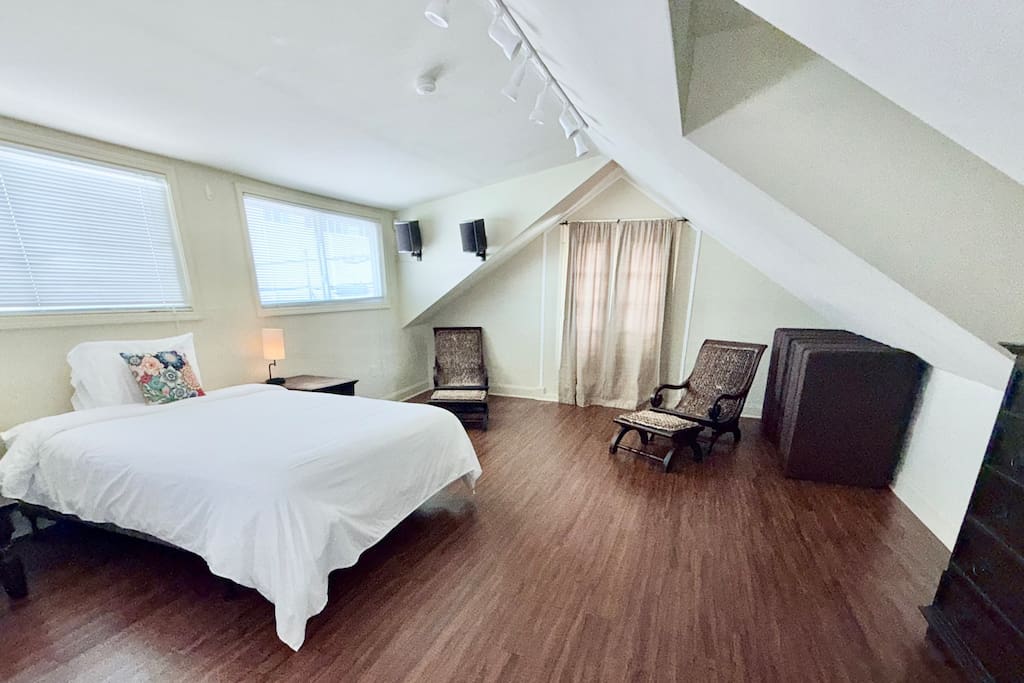 Large home with security and ultimate privacy. Large outdoor spaces for entertaining; rooftop deck, outdoor bar, large rain proof pergola with buffet/ seafood boil space and built-in, wrap-around bench seating. Overdo it last night in the quarter? Take a night off from the revelry and enjoy the show from the comfort of any one of our outdoor spaces after a big dinner and tree lined walk. Or grab a pizza and beer, then head outside for a chill night with friends. Listen to the show and enjoy the sounds of the audience without the crowds or the entrance fee! Out all night but not ready to go home? Enjoy your second wind at New Orleans best 24-hour bar, THE iconic Ms. Mae’s, within stumbling distance! Strong drinks, poker machines, pool tables, foosball tables, people watching and garden seating. International cuisine / culinary destination- all within walking distance! From Ramen at Nomiya to upscale but cozy, romantic Mister Mao. Best Mediterranean just blocks away; casual family owned and operated Saj or high-end Shaya. Theo’s Neighborhood Pizza or homemade pasta dishes and modern Italian at Osteria Lupo. Best tacos and tequila, just footsteps away! Old school seafood at Superior Seafood and Oyster Bar or step back in time at Pascals Manale for a classic dinner to remember! And don’t forget the countless coffee shops and must have French bakery items. The French Quarter has nothing on Uptown if you want a quality New Orleans dining experience. Eat like a local! - Fully furnished, 2300 sqft, 4 Bedrooms, 3.5 baths; - Master Suite, full bath. Private entrance and kitchenette, opening to back porch and courtyard. - Queen bedroom with private bathroom - Double bedroom - Queen loft with opening to large rooftop deck, overlooking our bamboo filled back yard on one side and French Doors with a view of the parade route during Carnival time. Cast your eyes further from both the deck and French doors to the city skyline. Perfect for enjoying cocktails, listening to the music at Tipitina’s and the people milling about on the sidewalk below. - Living room with entertainment/sound system, Pool table and TV. - Well-appointed kitchen with combined dining space. - Open concept music room with jukebox box and piano. - Courtyard space includes back porch with rocking chairs and outdoor bar, separate large pergola with built-in, wrap-around bench seating space, ideal for seafood boils or BBQ’s. Capacity: Sleeps up to 12.